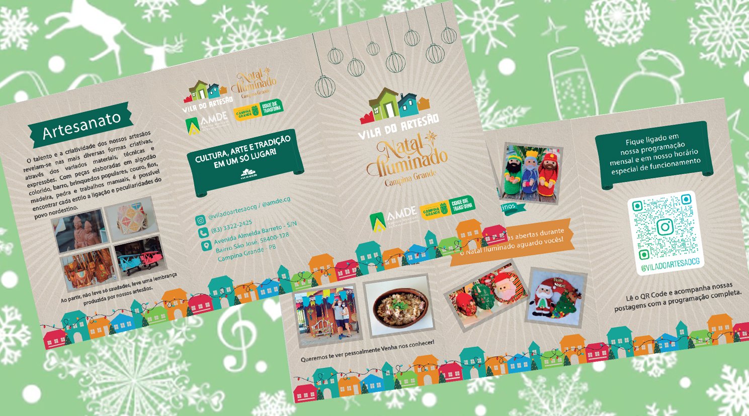 O folder natalino, cuidadosamente elaborado, é uma peça informativa que busca oferecer uma experiência completa aos interessados em conhecer e adquirir as obras artesanais da Vila do Artesão. O folder é composto por informações detalhadas e imagens dos produtos comercializados pelos artesãos, o material também inclui dados históricos sobre o local, proporcionando aos visitantes uma imersão na rica tradição artesanal da cidade.